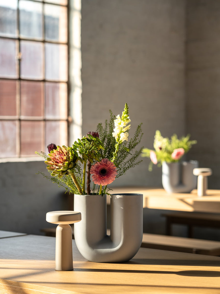 Adding sculptural elements, the Kink and Ridge Vases introduce playful, expressive forms while serving as vessels for fresh botanicals, a detail that bring life and movement to the tablescapes. Meanwhile, the Ease Portable Lamps offer adaptable lighting solutions, allowing staff to shape atmosphere throughout the evening, from bright social moments to moody late-night settings.