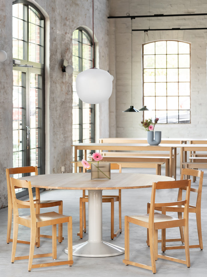 The dining area is anchored by Muuto’s Linear Wood Tables and Benches, which bring a sense of grounded simplicity to the space. Their clean lines and natural oak finish create a versatile backdrop for both casual gatherings and fine dining, emphasizing Muuto’s philosophy of functionality paired with timeless form.