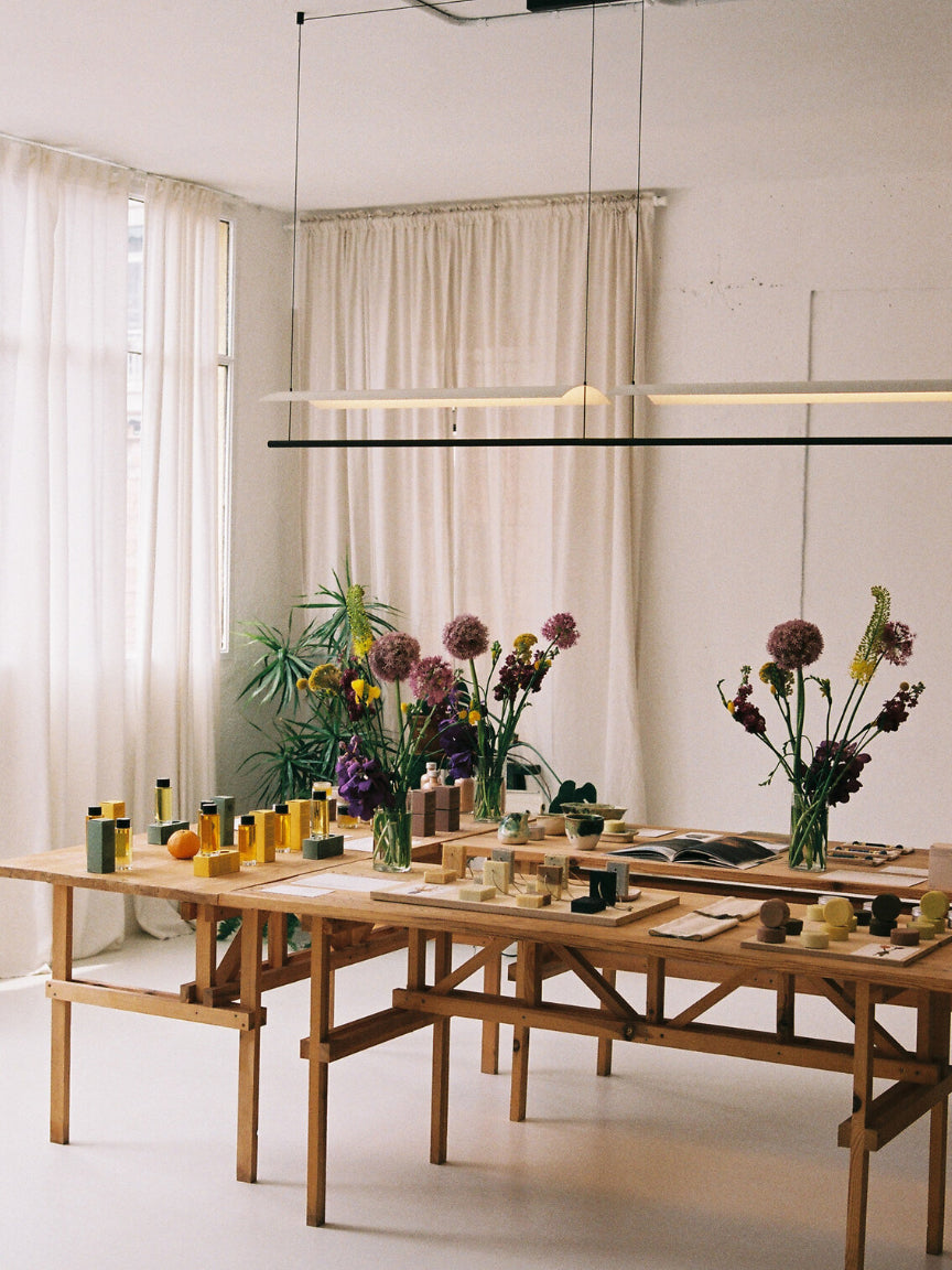Above the central marble-and-wood table by Heaps & Woods, the GT lamp with a green ribbon shade sets the stage for collaboration and creative work. Its timeless design bathes the workspace in an even, diffused glow, functional yet poetic. Among lush plants and flowers, the core ingredients of ROWSE’s natural cosmetics, the Lámina suspension celebrates the art of reflection. Its subtle design elevates product displays with light that is both precise and atmospheric.