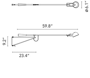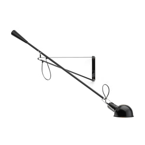 Seeming to defy gravity, the Mod 265 wall lamp by designer Paolo Rizzatto is in a category all its own. Multi-angle rotatable head and long, adjustable swing arm wall lamp.The lamp head-which rotates 360-degrees so that it can be aimed in any direction-provides a clean, direct light. The body is painted steel, with an adjustable arm and reflector. There is a chrome-plated brass reflector support. The counterweight is tapered cast iron. There is an on/off switch on the socket holder, and a plug in power cord measuring 80-inches. Available in black and white finish. Perfect for illuminating a dining table or the bedside. Inspired by a minimalist design, Paolo Rizzatto created this timeless piece in 1973.