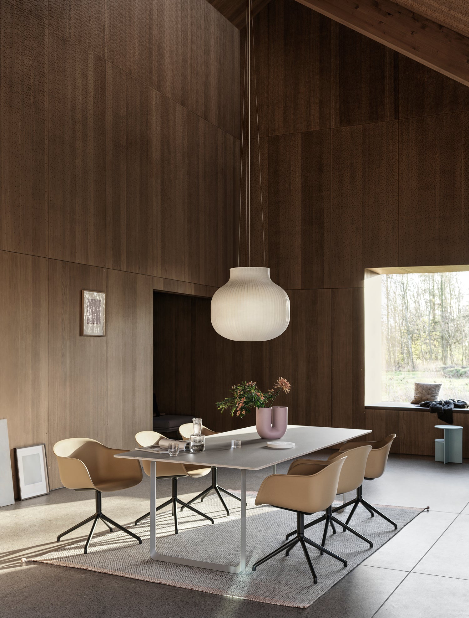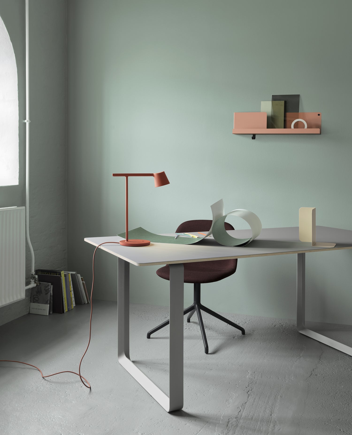 A simple design with a light expression that creates a striking profile. The almost reduced design is balanced with fine details in the plywood layered table top and form of the angular frame. Organize and manage cords and wires with the Cable Management. Optional Power Outlet can also be added to the 70/70 Table.