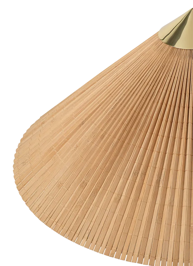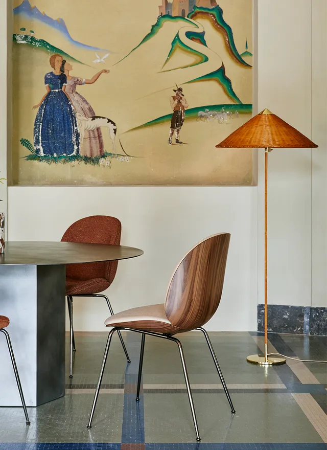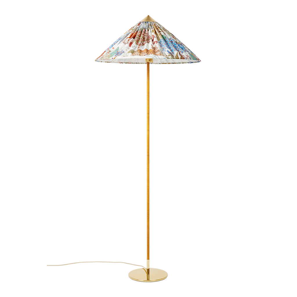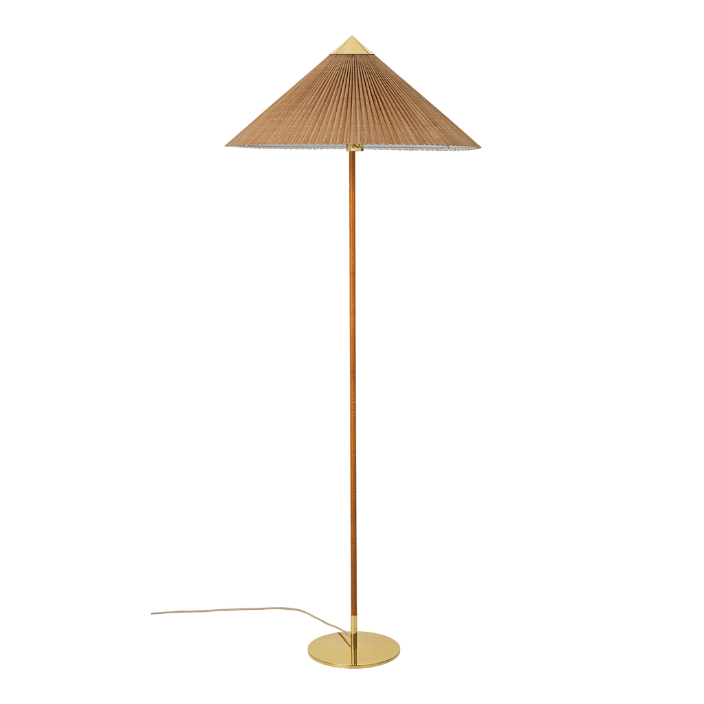 The 9602 Floor Lamp, also known as "Chinese Hat" was designed by Paavo Tynell in 1938 for the hotel Aulanko. Characterised by its elegant and airy lampshade and rattan-covered stem, the 9602 Floor Lamp shows the designer's limitless imagination and unparalleled ability to create designs of enduring beauty. Adding a playful, exuberant quality to the top, balanced by the more static form of the base, the 9602 Floor Lamp is perfectly suited for creating a gentle ambient light in the domestic living room.