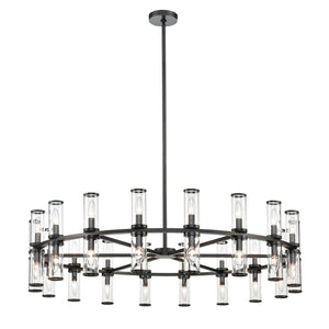 Evoking the elegance of antique candle-holders, Revolve has clear glass tubes accented with metal rings, gathered around a striking chandelier body. Available in multiple finishes, also available as a series of coordinating vanity and wall sconces.
