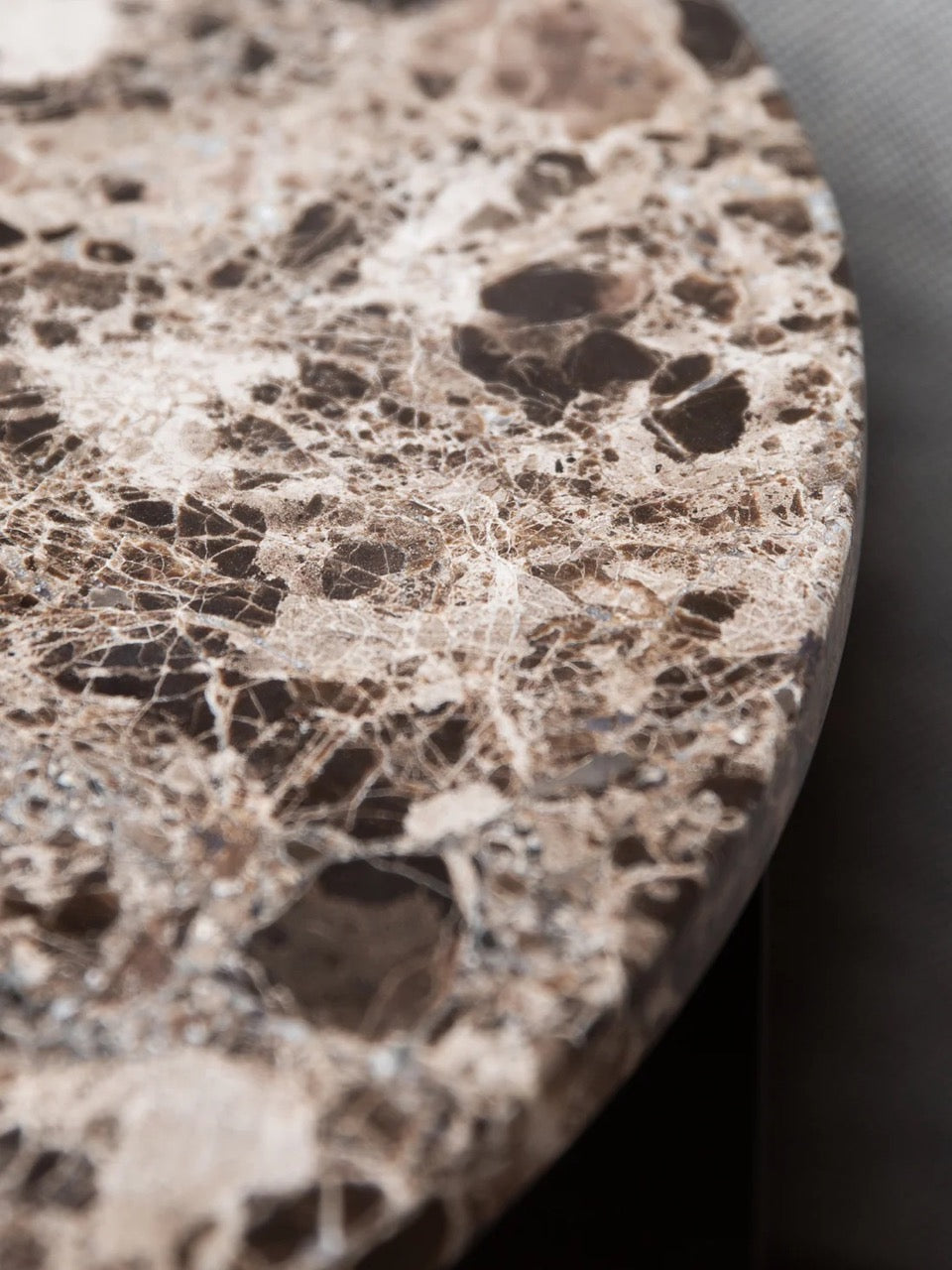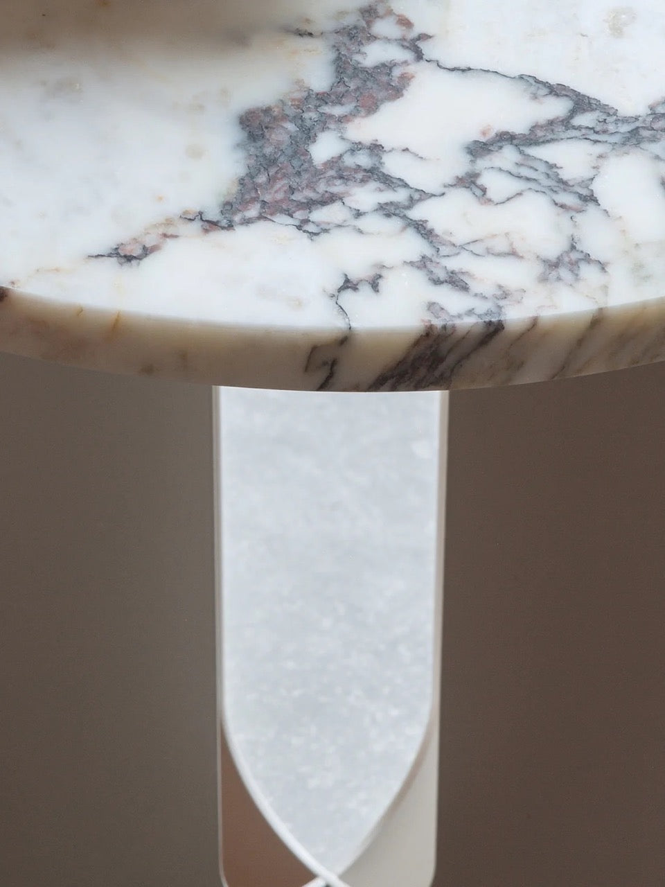 The table is useful for everything from small restaurant spaces and bedsides to exhibition spaces. The shine of the honed marble surface against the matte steel results in a versatile visual identity that is both modernist and industrial.