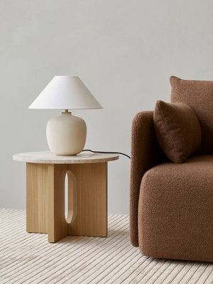 Perfectly proportioned with an intriguing combination of masculine and feminine elements, the Androgyne Side Table is a lesson in contrasts. Making clever use of craftsmanship, the round tabletop overhangs the wide, flat legged base in a meeting of solid and soft lines. Both base and top are sold separately and are available in natural or dark stained oak, walnut and Kunis Breccia stone respectively for a complete and customized furniture piece.