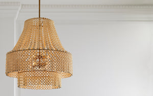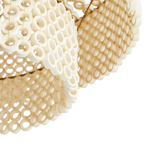 Its oversized scale makes the Hannie Chandelier the ultimate statement piece. Suspended by an antique brass pipe, a beaded white wood empire silhouette lays the foundation for creative detailing, including hand-carved circular beads that layer to diffuse light throughout a space. Finish will vary. Additional pipe available (PIPE-464).
