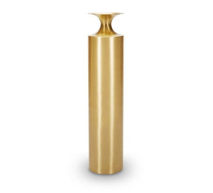A group of floor vessels in three unique shapes. Made from brass, the Beat Vessels are spun and welded in separate parts to create their form.