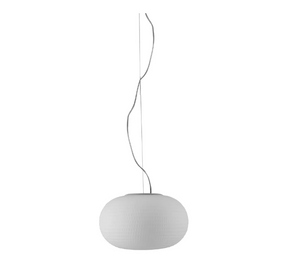 Suspension lamp with diffused light, phase cut dimmer. Milk-white diffuser made of blown glass with satin-finish. Steel suspension cable. Transparent power cable. Painted polycarbonate ceiling rose. Integrated led.