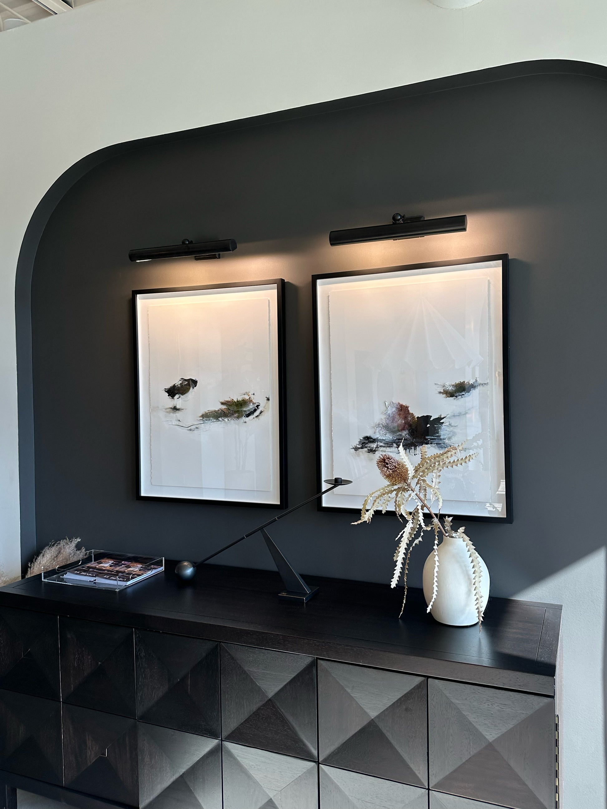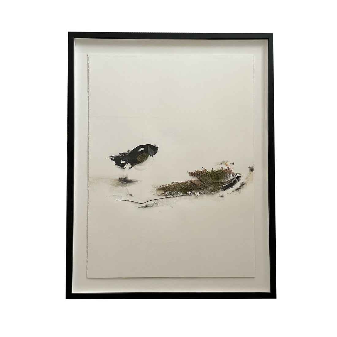Through delicate interplay of pigment, graphite, and collage, De Ano captures the tension between motion and stillness, interior and exterior, control and surrender. The restrained palettes—muted earth tones, blacks, and hints of rust—speak to both solitude and resilience. Framed with intention and negative space that breathes around each piece, Cabin Fever I & II invite contemplation, suggesting that even in confinement, creativity and reflection find room to expand.