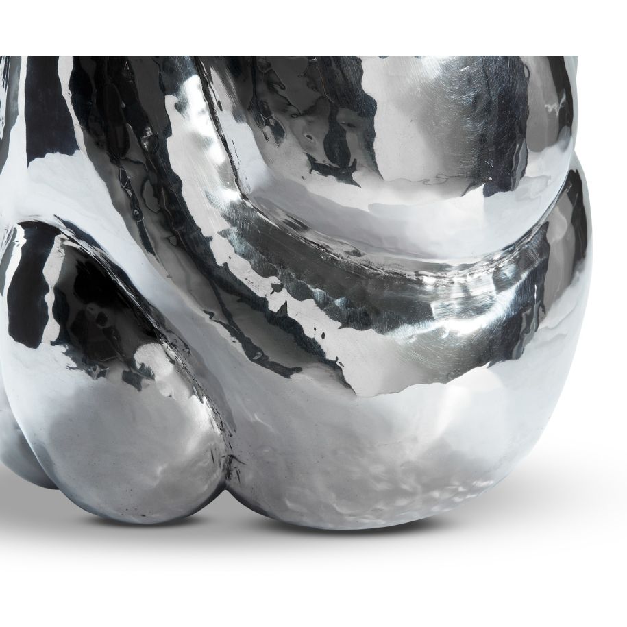 Cloud is a sculptural short vessel made of highly reflective polished aluminium. Handmade in India by skilled artisans, each vessel has unique qualities with every hammer and indentation from stretching and warping the metal being preserved, reflecting the amount of work that has gone into the design. The silver vessel's shape is reminiscent of seedpods and can be used for a variation of purposes, such as a champagne bucket or as a vase.
