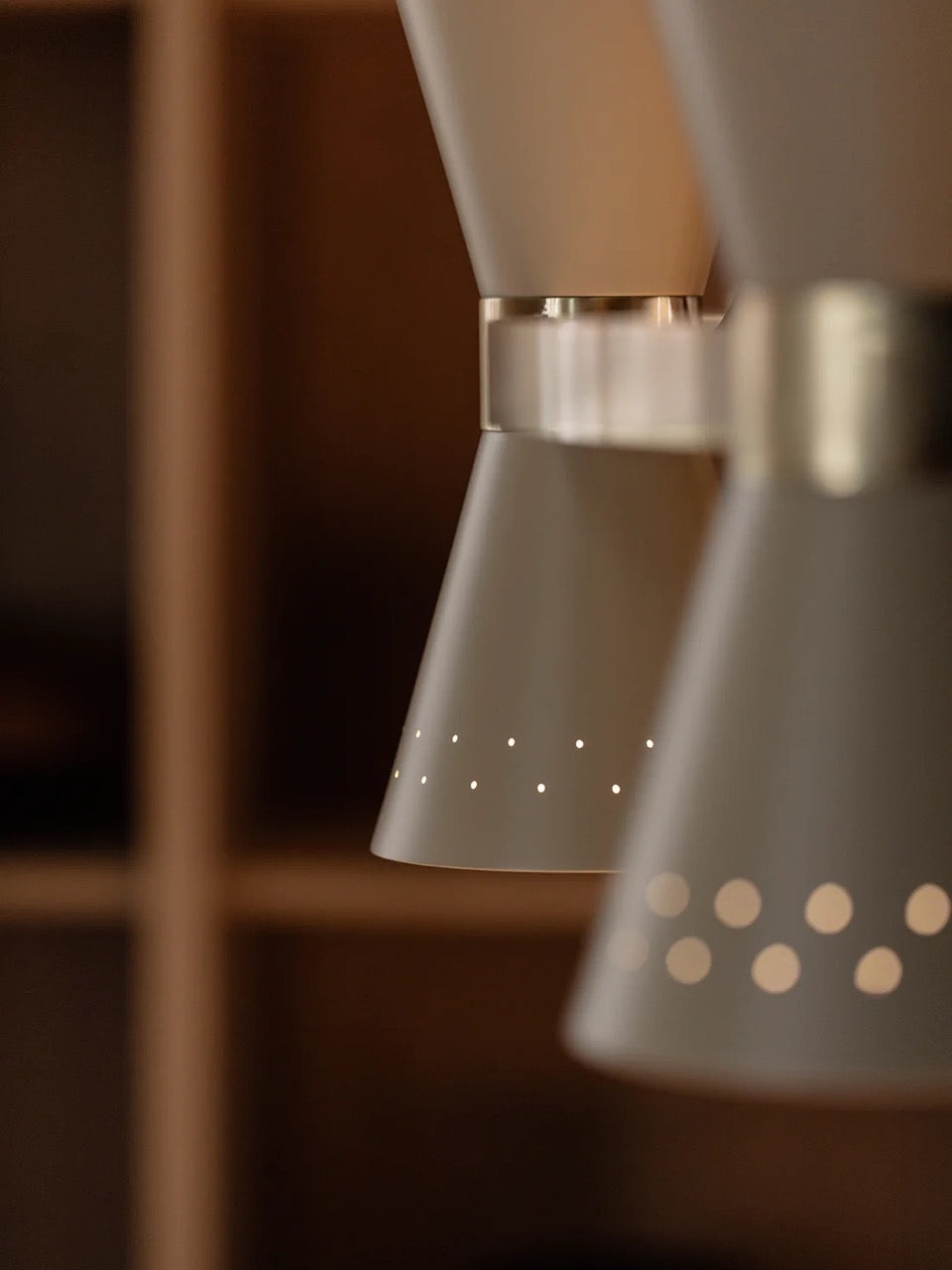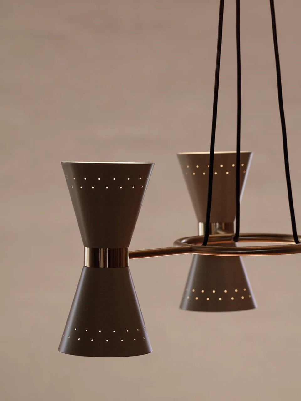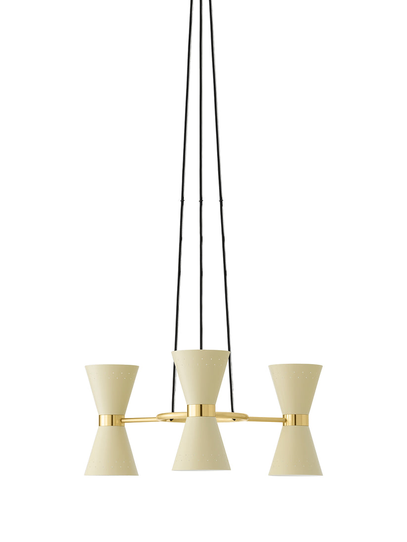 Imagined by the industrious Swedish furniture designer Alf Svensson in the 1950s, Chandelier 3 is one of three lighting designs in the Collector series. Shaped from a central band of solid brass, six conical metal shades direct the light upwards and downwards to illuminate with ambient light. Small perforations in each shade disperse the light outwards, creating intriguing shadows. The sophisticated mid-century design has timeless appeal thanks to its considered combination of graphic beauty and classic elegance. Not only functional, it is also a decorative lighting fixture in any space.