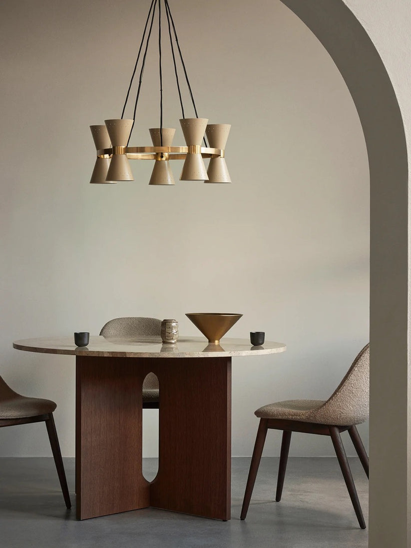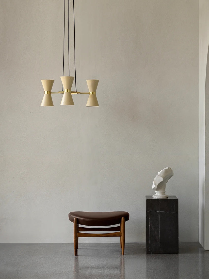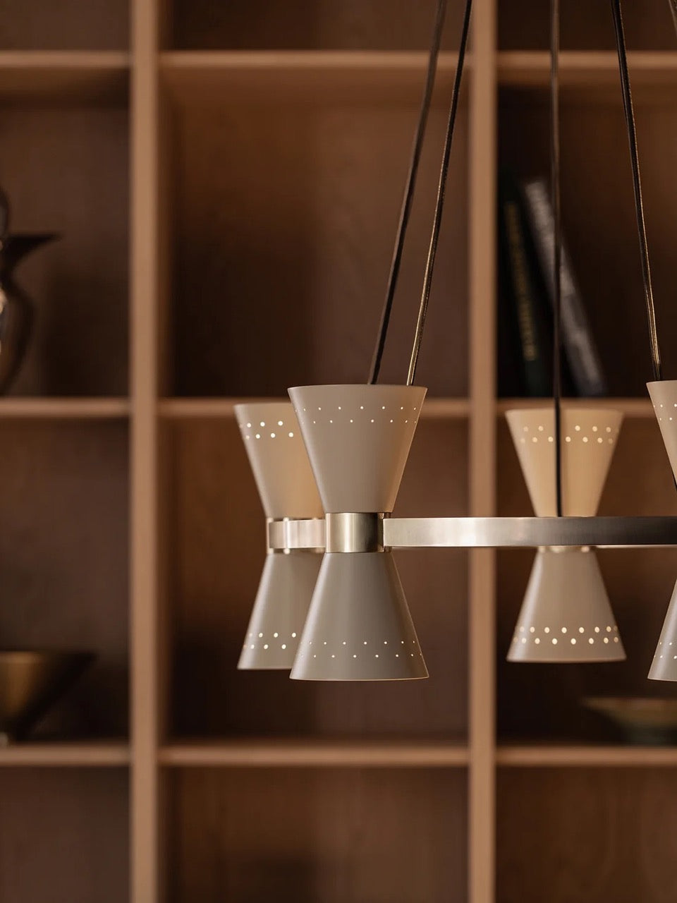 Imagined by the industrious Swedish furniture designer Alf Svensson in the 1950s, Chandelier 3 is one of three lighting designs in the Collector series. Shaped from a central band of solid brass, six conical metal shades direct the light upwards and downwards to illuminate with ambient light. Small perforations in each shade disperse the light outwards, creating intriguing shadows. The sophisticated mid-century design has timeless appeal thanks to its considered combination of graphic beauty and classic elegance. Not only functional, it is also a decorative lighting fixture in any space.