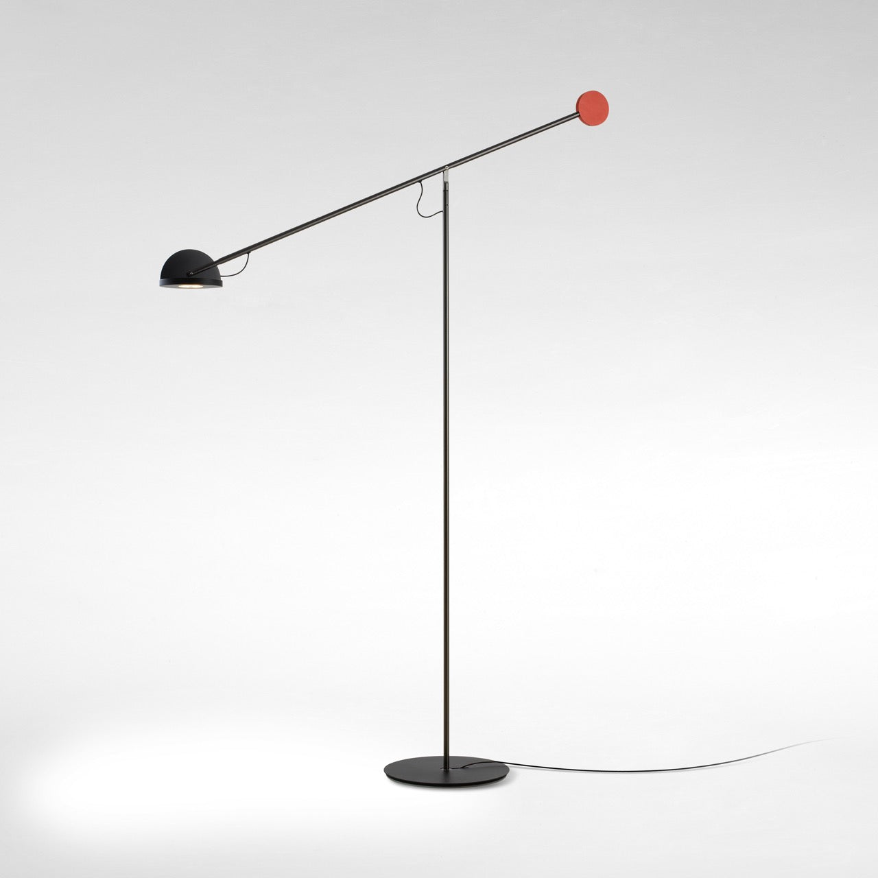 This collection consists of a table and floor lamp, as well as a separate torchier-style floor lamp, all of which use mixed materials of different densities, such as aluminum and steel, to create a unique counterweight system. This structure affords great precision when moving the lamp, reaching different heights and distances to adjust the position and direction of the light beam.