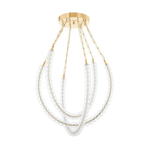 Add instant drama overhead with this show-stopping, jewelry-inspired chandelier. Clear cast glass beads are strung through swooping LED tubes with a Vintage Brass finish. Three of the beaded tubes are then strung around each other and hung from the canopy. The result is a gorgeous, airy teardrop silhouette that puts on a dazzling display when lit.