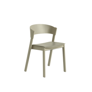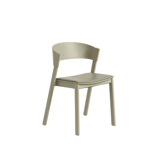 The Cover Side Chair is made from form-pressed wood. The wood is folded over the chair's legs and backrest. This technically innovative wood layering helps lock the elements of the chair together. Upholstered seats with textile, imitation leather, or leather. Leather from selected premium leather suppliers. Back and seat in oak veneer, solid oak frame and legs. Water-based lacquer. Plastic glides. Stacking Pad in felt made from 60% post-consumer recycled content. Oak veneer and Stained Dark Brown: slight color variations can occur due to the inherent characteristics of the material.