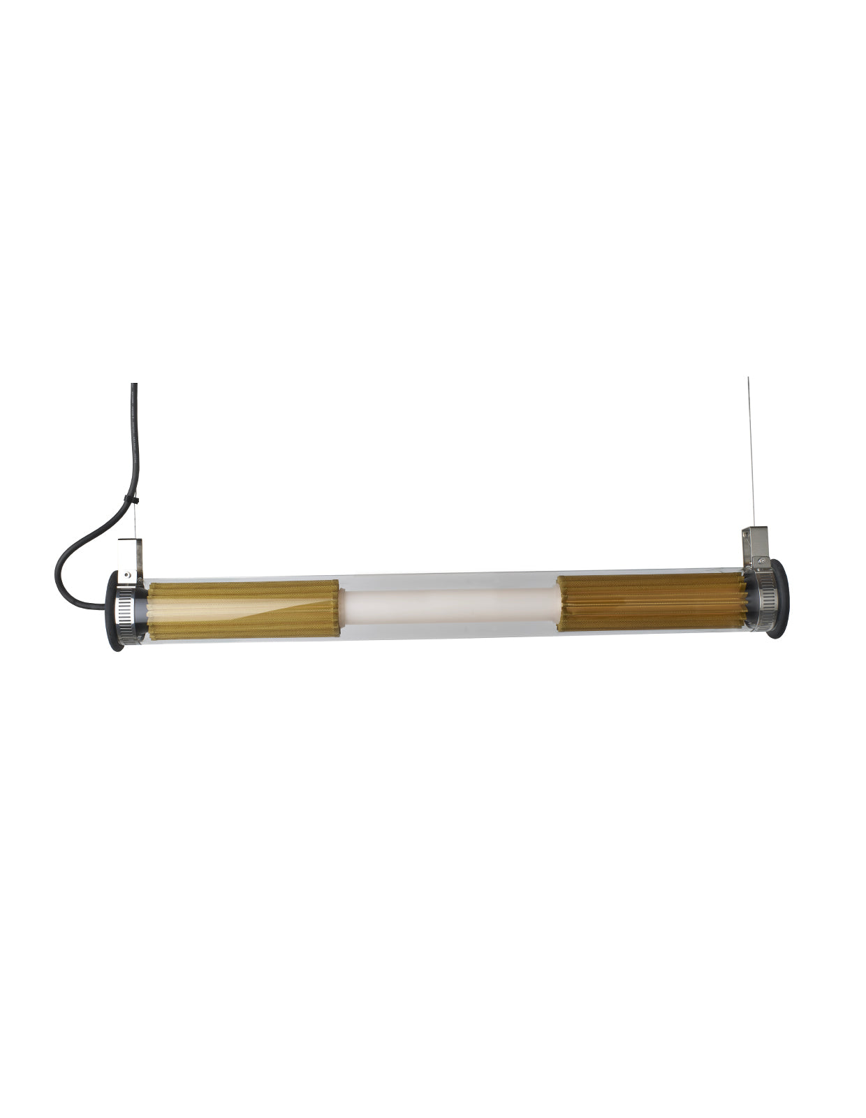 Horizontal pendant lamp in borosilicate glass and brass or stainless steel mesh. The light source (LED on aluminium profile) emits 360° over 100% of the tube's length.