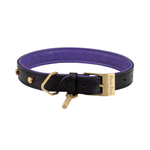 The outside of the collar is finished in black buffalo leather, gently embossed with our ‘B+P’ pattern and the inside made from super-soft cow leather, naturally stained in purple. The adjustable closure buckle is made from solid pvd brass with our logo laser-etched into it.