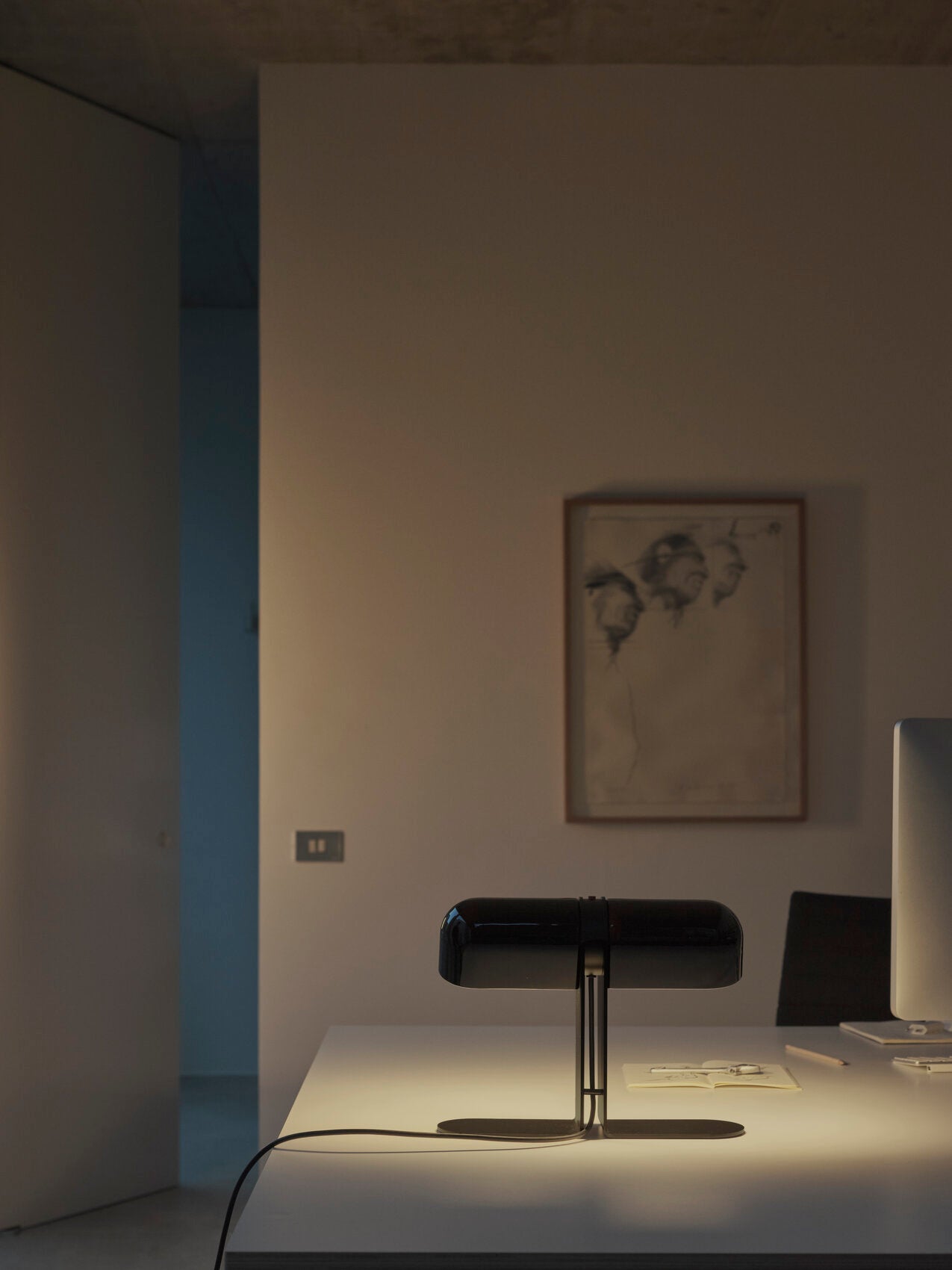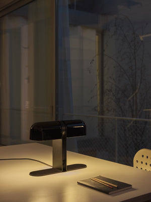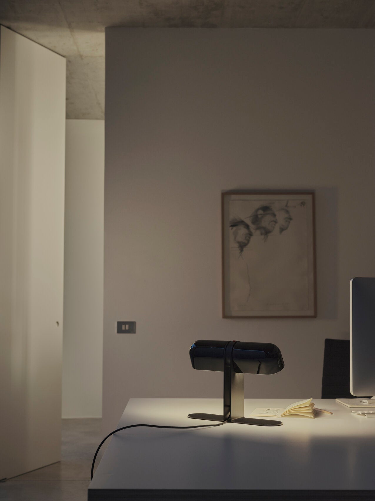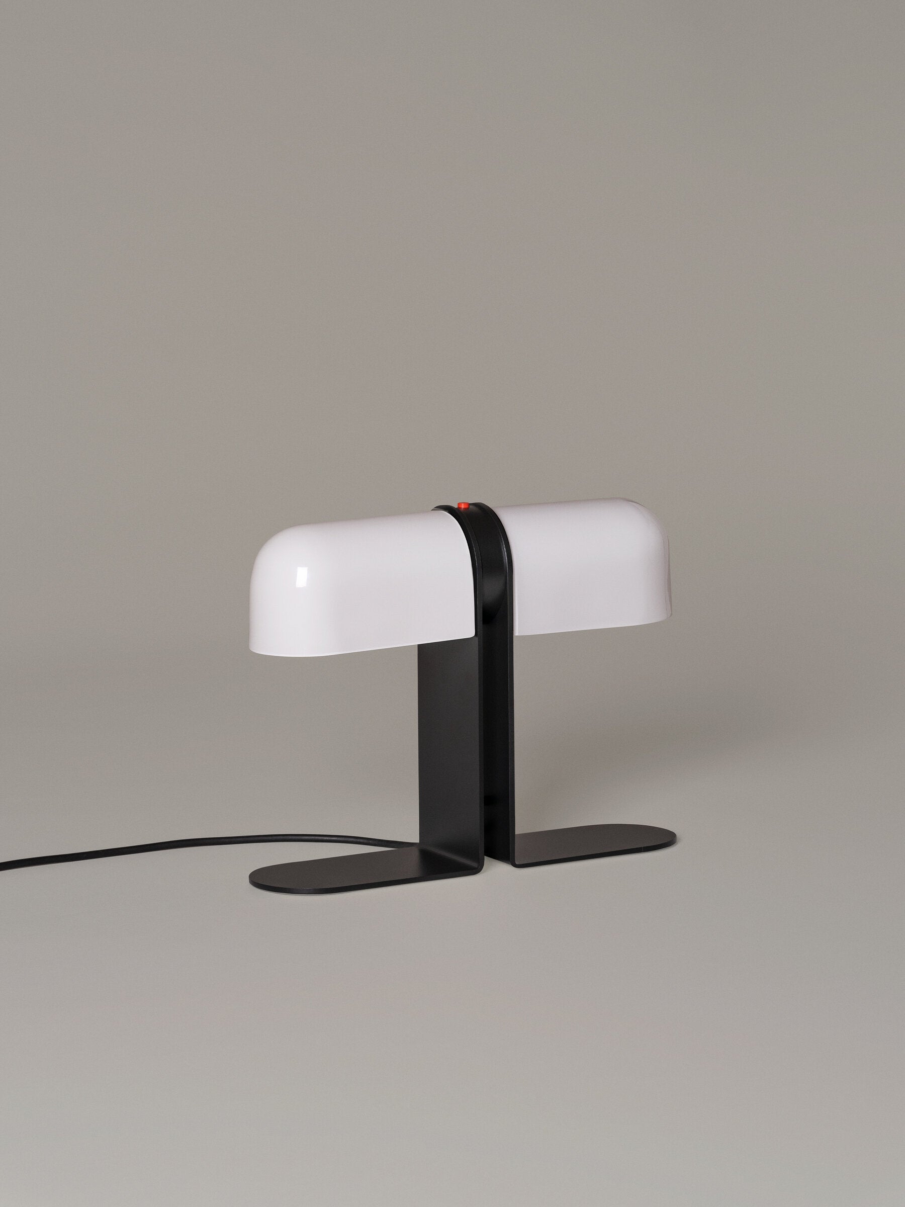 The Duo lamp was conceived by Andre Ricard for "executive desks", not only that good focal light was required when going through extensive paperwork, but also the fact that, in the face of visitors, the view of those who sat in the confidants' chairs should not be obstructed by a large or ostentatious lampshade. Duo fulfills both purposes seamlessly. It illuminates with proximity, and does not interrupt the visual horizon. It is composed by two symmetrical and opposite elements, yin and yang, which complement each other with an excellent sense of proportion. The luminous flux is adjustable by the independent rotation of its glass shades, which can be opaque to focus the light on the work surface, or translucent to provide a more general illumination too. An obvious push button located in the narrow central body acts as a switch for both. It was manufactured during the 1970s and was discontinued in the 1980s due to the onslaught of the new halogen lamps, which tried to emulate the worldwide success of Richard Sapper's Tizio. Today, with the comfort and efficiency of LED technology, the Duo shape makes more sense than ever. The definitive 2023 edition, in collaboration with the author, enhances the aesthetic and functional user experience wherever it is used.