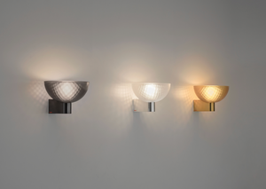 FATA The magic comes from the shade and from a new mould forming and engraving process that reflects light in infinitely different ways depending on how you view the lamp. As soon as Fata is switched on, it becomes hidden in an amazing game of light, like a little magic tower that adds mystery and cheer to the home. The bowl-shaped applique comes in three colours – amber, smoke and transparent.