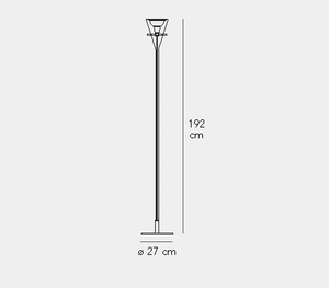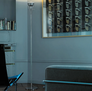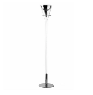 Floor lamp indirect and dimmable light with sliding switch. Transparent borosilicate glass stem. Reflector made of glossy chromed aluminium. Base and reflector support made of chromed metal. Transparent power cable, dimmer and plug. Schuko plug, adapter and bulb not included.