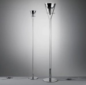 A glass cone holds the chromed aluminum reflector, supported by three slender metal rods. Equilibrium and lightness for this family of lamps available in floor and wall versions, for indirect light emission, and in a hanging version, for direct focused light.