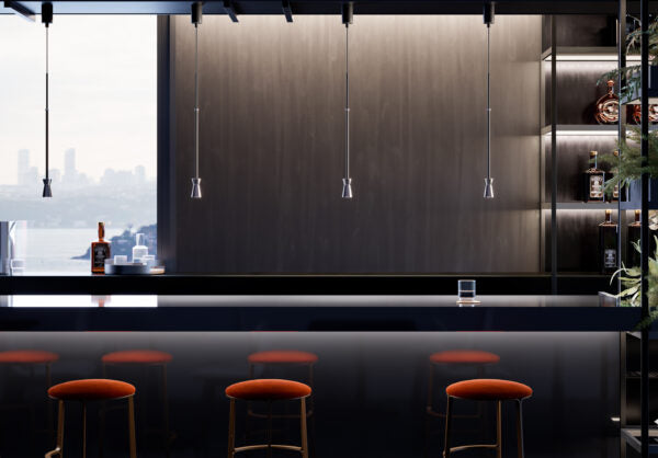 An innovative pendant lamp, born from the idea of a portable and luxurious product to meet specific space and installation needs; this makes it suitable for contexts such as, historic buildings, private homes or exclusive boutique stores. The head recalls a cocktail jigger (as the name G+T, or gin & tonic, suggests), and the arm is in brass covered with braided leather.