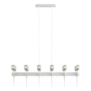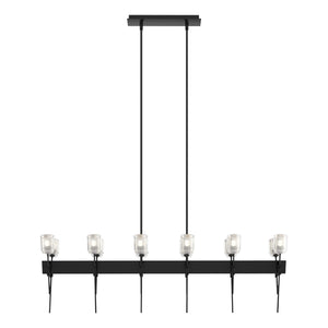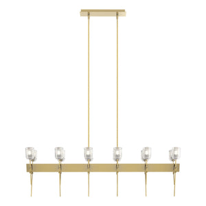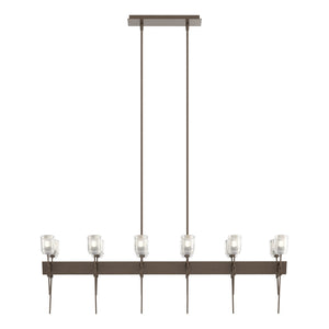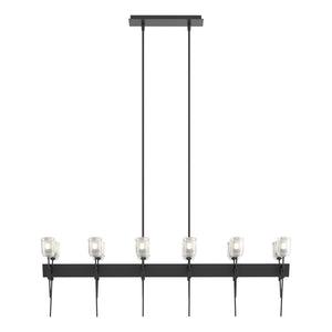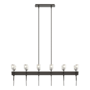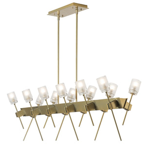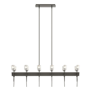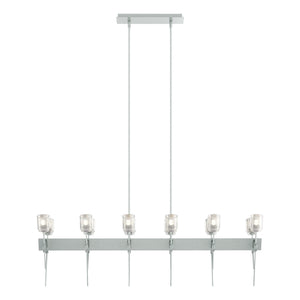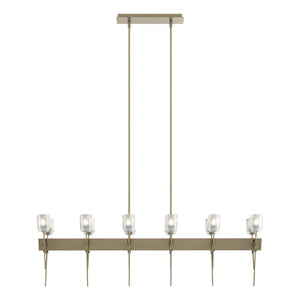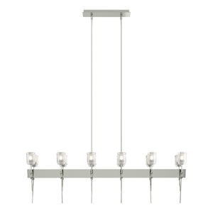 Rough, forged "hands" gently holding a delicate glass flower was the inspiration for the individual elements of the Echo 12-Light Linear Pendant. The look is echoed in this lighting fixture creating a harmonic blend of alternating lengths. The glass is thick and frosted, perched on a delicate stem.