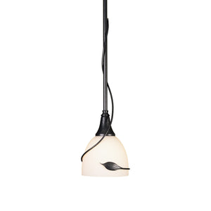 Our pendant is an example of "sylvan steel." A single tendril curls down the steel tube to wrap around the glass bowl, culminating in a finely-forged steel leaf. Handcrafted by artisans at our forge here in Vermont, each piece is unique.
