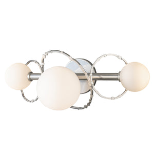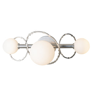 The Olympus 3-Light Bath Sconce features the Olympus Collection's forged and hand-hammered and stamped steel rings that intersect the wall sconce's bar mounted to a small, round backplate. With varied sized glass globes, the Olympus Bath Sconce is playful and modern and may be positioned horizontally or vertically. Available in Black, Oil Rubbed Bronze, Vintage Platinum, Soft Gold, Sterling and Modern Brass.