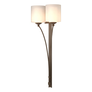 Our Formae double sconce offers a contemporary take on the traditional taper. Tubes of curved steel slowly peal from the central mounting plate to form gentle arcs under the glass of the cylinders. Forged and formed by our artisans, each piece is unique.