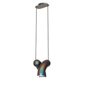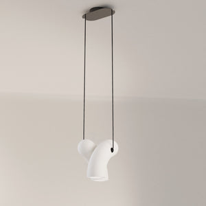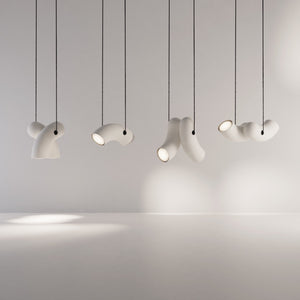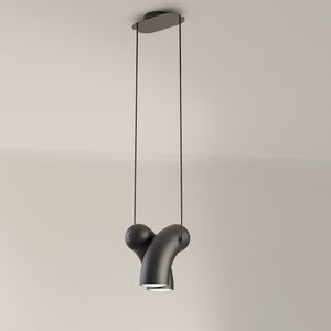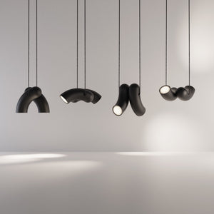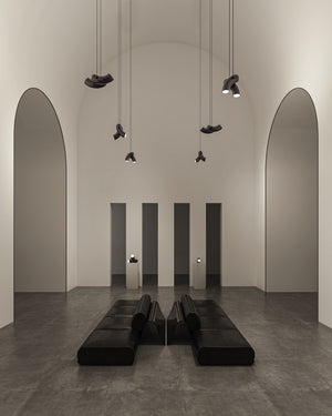 Hanging, the Hyphen collection’s two cylindrical bodies are joined by a pivot that offers several light positions and orientations projecting a