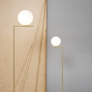 Emitting a warm and beautiful diffused light, this contemporary indoor floor lamp features a blown opaline glass diffuser. The body is brass- or chrome-finished steel. There is a dimmer on the power cord. IC Lights floor lamp comes in two models and is available in black, brass or chrome finish:- IC Lights F1: 53" H- IC Lights F2: 73" H