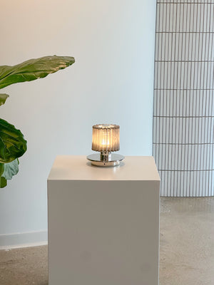 Cordless table lamp powered by a rechargeable battery. The In The Sun collection designed by Dominique Perrault and Gaëlle Lauriot-Prévost pays homage to the Sun King. Its 5-position switch lets you vary the light intensity, and bathes the table that hosts it with its joyful lights and festive shadows. This table lamp, a real jewel candle, is part of the Cordless Collection.