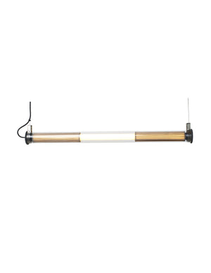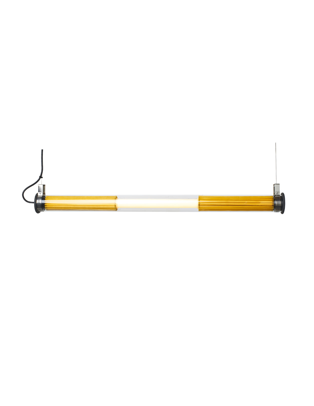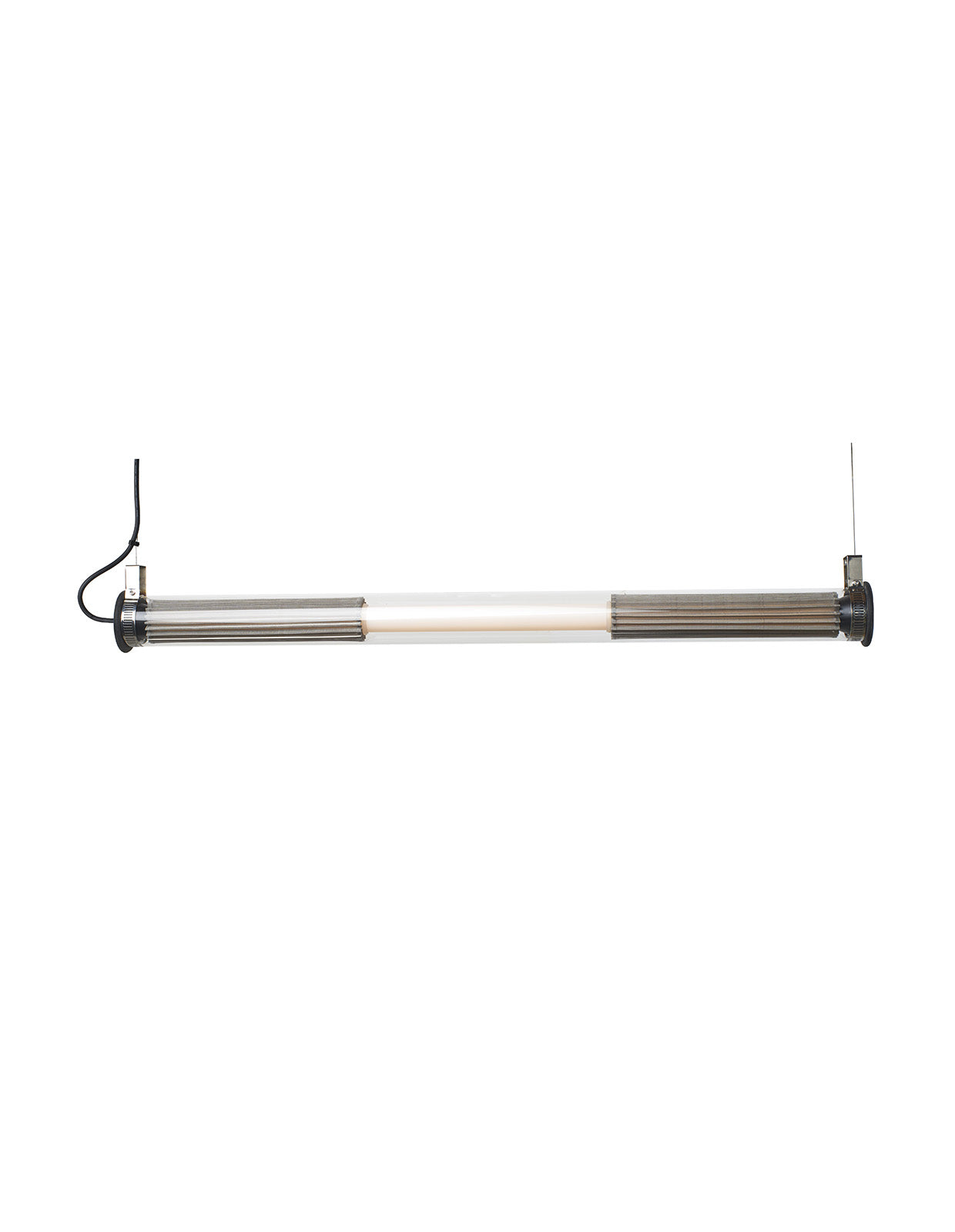 Horizontal pendant lamp in borosilicate glass and brass or stainless steel mesh. The light source (LED on aluminium profile) emits 360° over 100% of the tube's length.