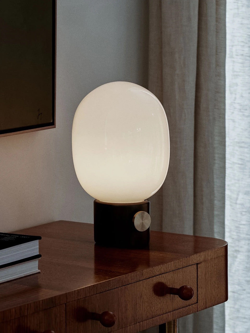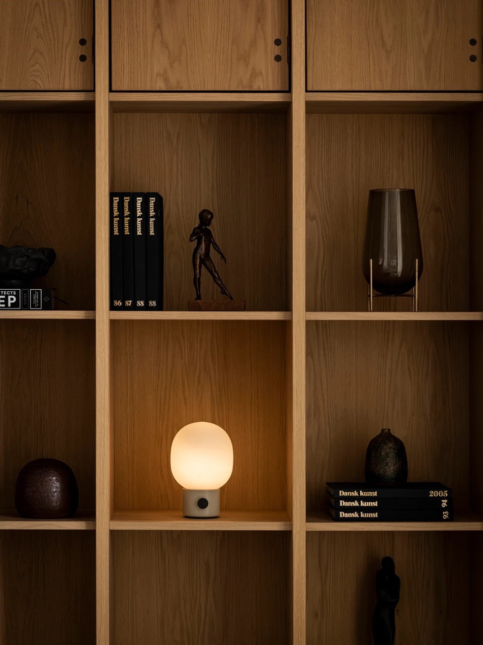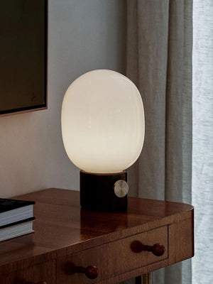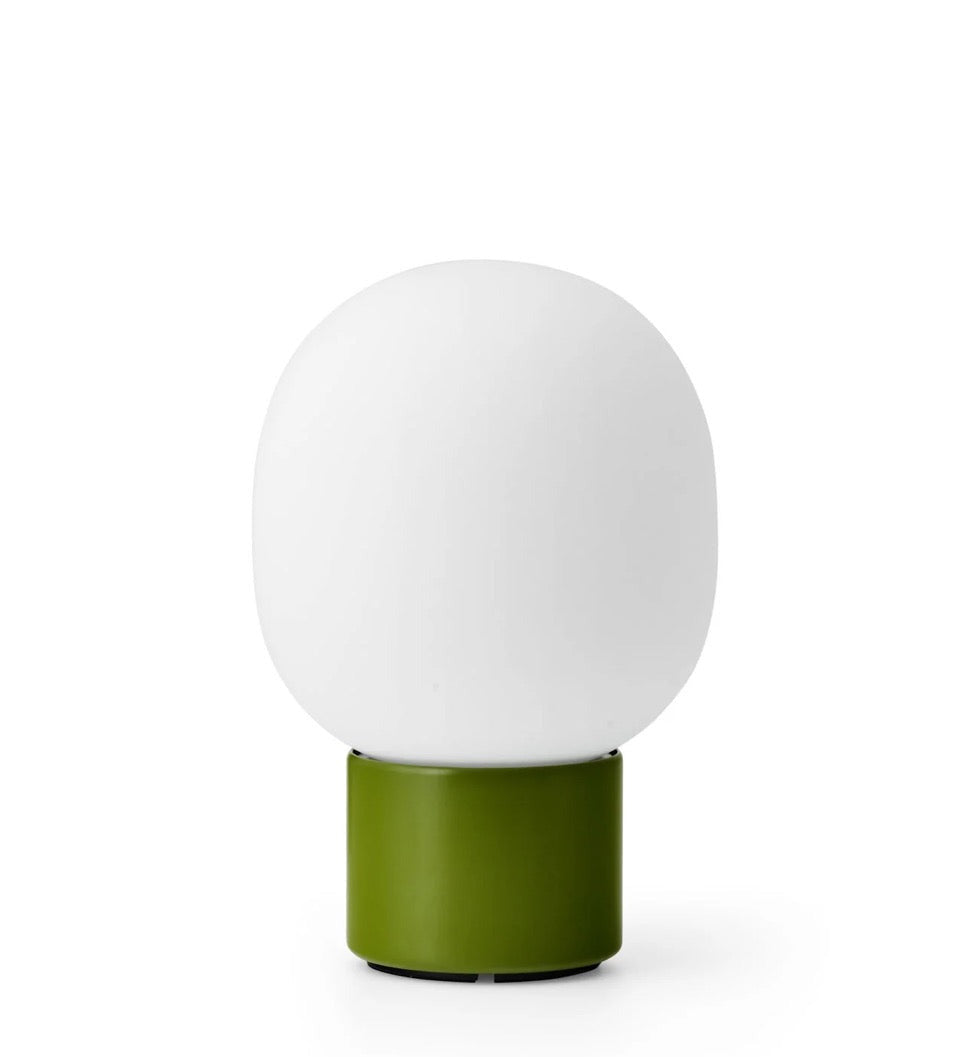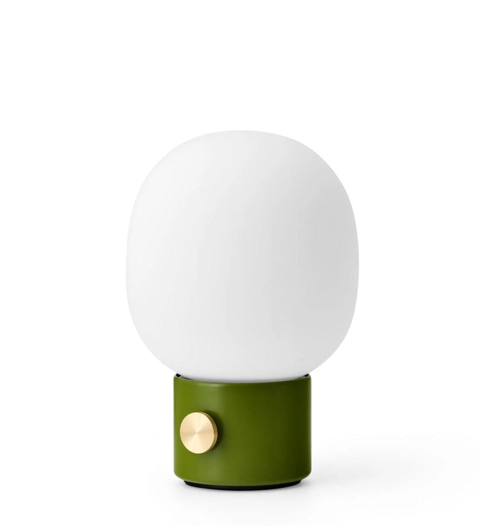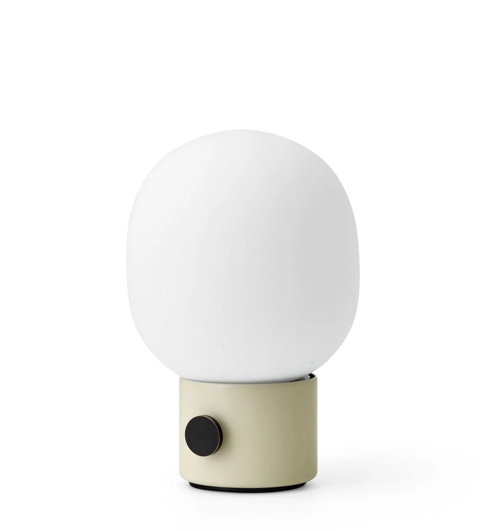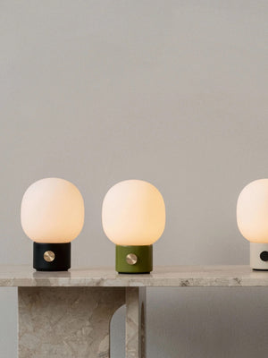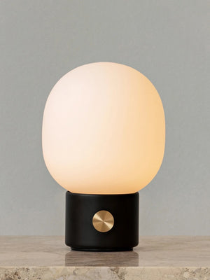 Our classic JWDA Lamp in a cordless version. Inspired by traditional oil lamps and crafted in contrasting materials, the JWDA Portable has the freedom and flexibility to move anywhere you want. Delivering 10 hours of adjustable light when fully charged, the small-scale design is defined by its elliptical glass shade and solid metal base with a brass dimmer switch. The cordless design charges via a concealed magnetic connector and USB cable. The cable charges with a standard USB charger plug. Comes without charger plug. The lamp is compatible with Audo's Charging Board.