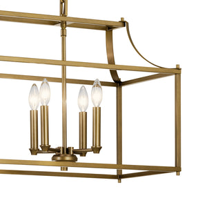The Morrigan 8 light linear chandelier in a Natural Brass finish highlights the beauty of candelabras with a modern twist of clean lines, an open cage structure, and curved design detail. Its traditional inspired style mixes nicely with a variety of looks.