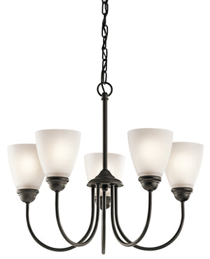 The Jolie 18.5" 5 light chandelier features a classic look with its Olde Bronze finish and satin etched glass. The Jolie chandelier is perfect in several aesthetic environments, including transitional and traditional.