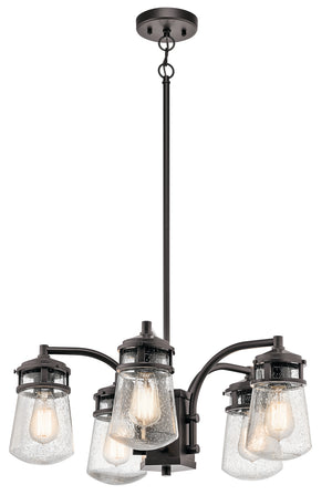 This 5 light outdoor chandelier from the Lyndon collection combines a simple streamline design with an emphasis on traditional details. Featuring a beautiful Architectural Bronze finish and Clear Seedy Glass, this fixture can effortlessly blend with your existing décor.