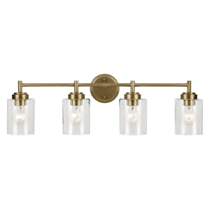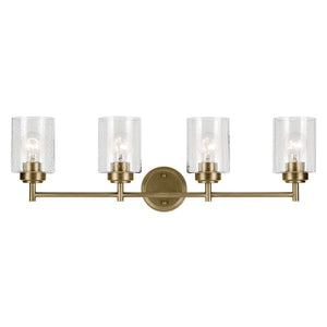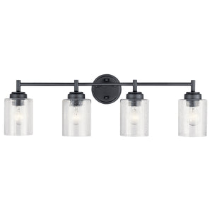 The modern Winslow 4-light 30" bath light in a Black finish with Clear Seeded glass shade pair beautifully with the linear arms, bringing light and dimension to a space.