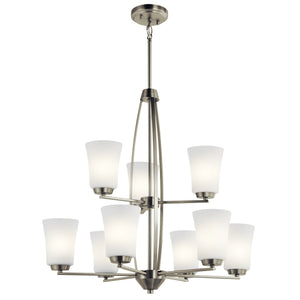 The Tao collection 9-light chandelier comes in a Brushed Nickel finish. The collections Asian influence takes many forms, from balanced cage-like structures to rectangular lantern-inspired glass. The result is a look thatâ€s pure and peaceful, with a nod towards arts & crafts style.