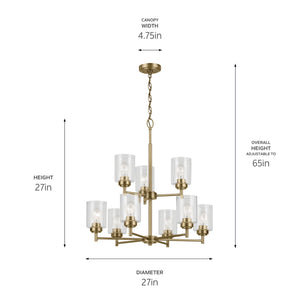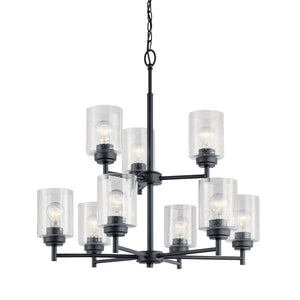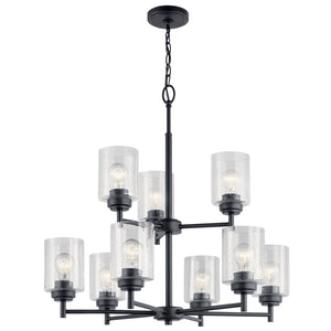 The modern Winslow 9-light chandelier in a Black finish with Clear Seeded glass shade pair beautifully with the linear arms, bringing light and dimension to a space.