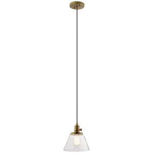 Create a mix and match masterpiece with this 1 light pendant from the Avery collection. Available in a Natural Brass finish with adjustable cording, Clear Seeded glass, and working paddle switches, this pendant stands out beautifully on its own or in a cluster.