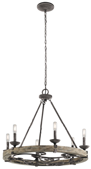 The Lodge inspired style of this 6 light chandelier from the Taulbee collection features an elegant, timeless design with Weathered Zinc detailing coupled with Weathered Grey Wood veneer accents.