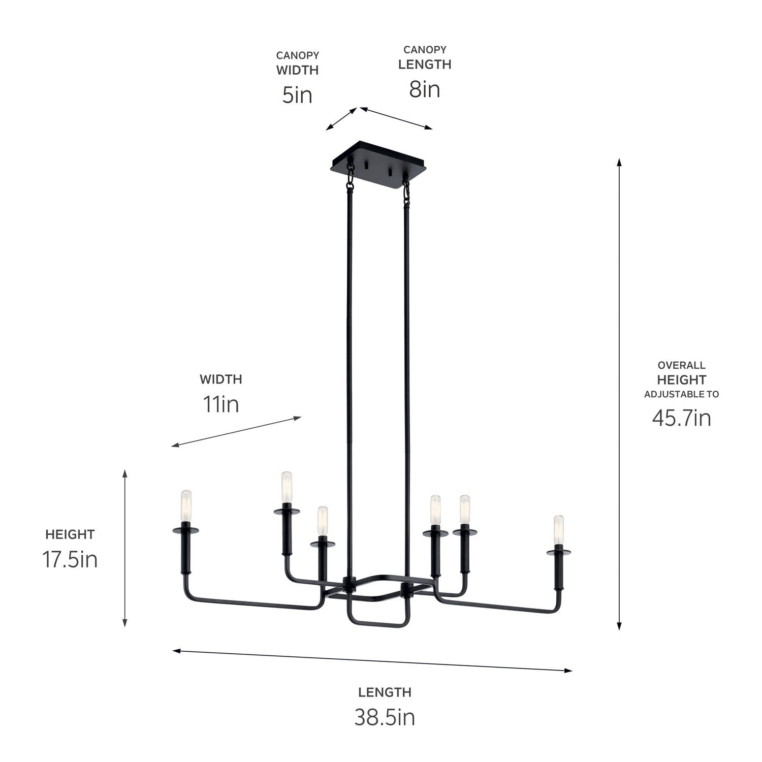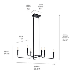 The Alden 17.5" 6 light linear chandelier features an asymmetrical classic look with its Black finish. The Alden is perfect in several aesthetic environments, including traditional or mid century modern.