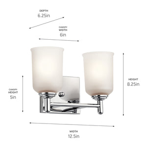 The Shailene 12.5" 2 light vanity light features a classic look with its clean lines in Chrome finish and satin etched glass. The Shailene vanity light works in several aesthetic environments, including traditional and transitional.