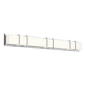 Electroplated orthogonal steel structure and details. Rectangular opal acrylic diffuser. Up and down wall light. May be mounted horizontally or vertically