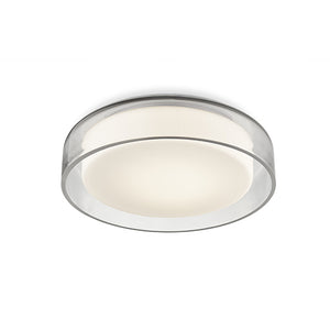 Clear round aesthetic glass. Opal glass cylindrical diffuser. Powder-coated white steel ceiling plate. Down light. Custom options available.