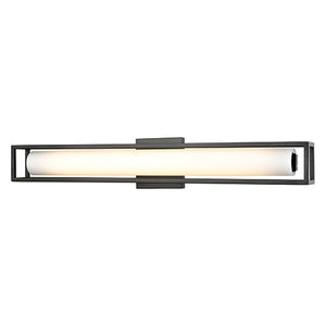 Square powder-coated steel frame. Extruded aluminum heatsink mounted to square wall plate. Cylindrical opal glass diffuser. Outward emitting wall light. Custom options available.