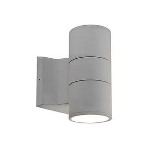 High powered LED exterior two light wall mount fixture, die-cast aluminum housing molded into a cylinder shape with in powder coated black or gray finishes. Concealed inside is our 120V AC LED technology with a tempered glass diffusers radiating light upward and downward against the wall where installed. Certified ETL wet location listed and is available in different sizes and one light options (see Nordic family for details).