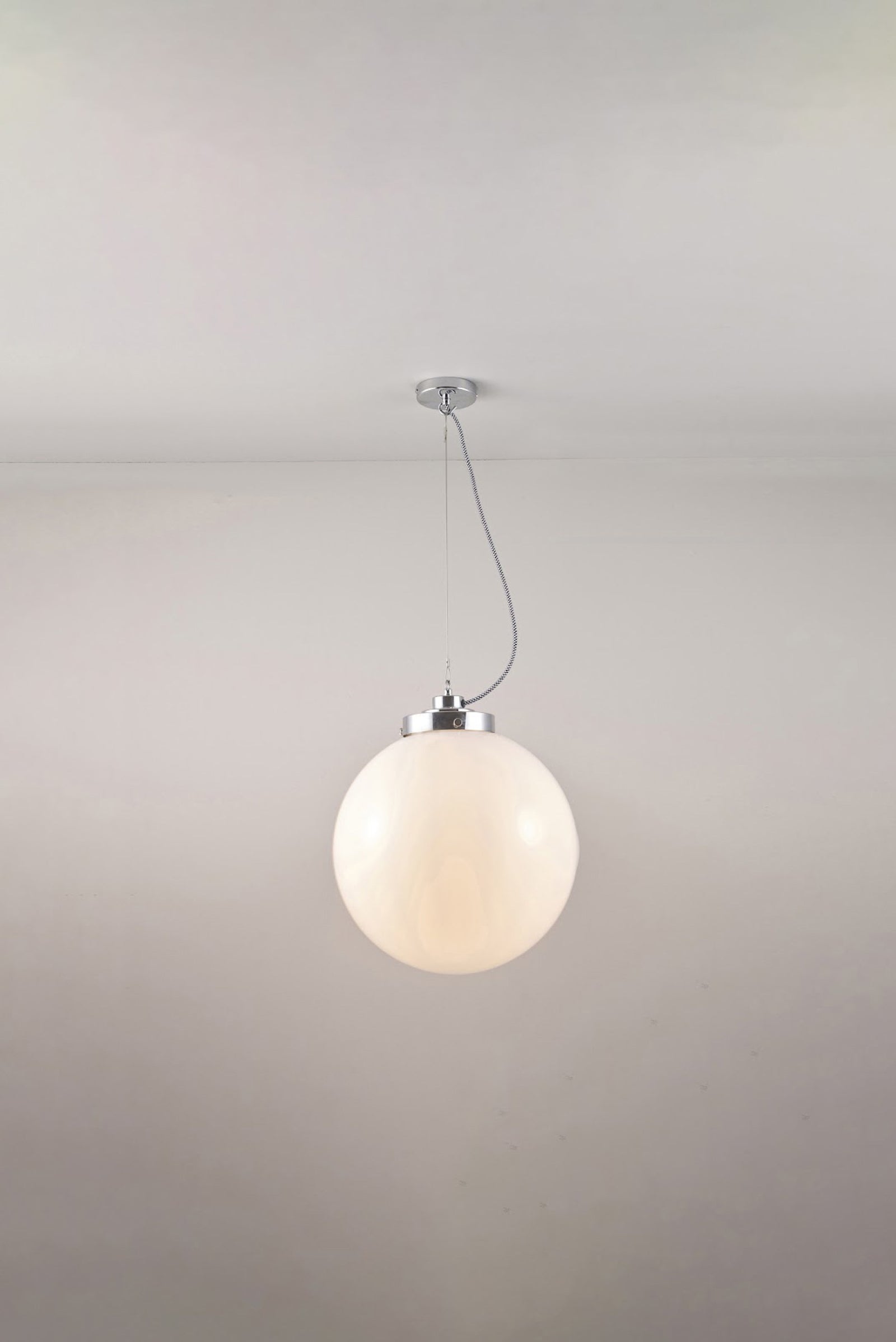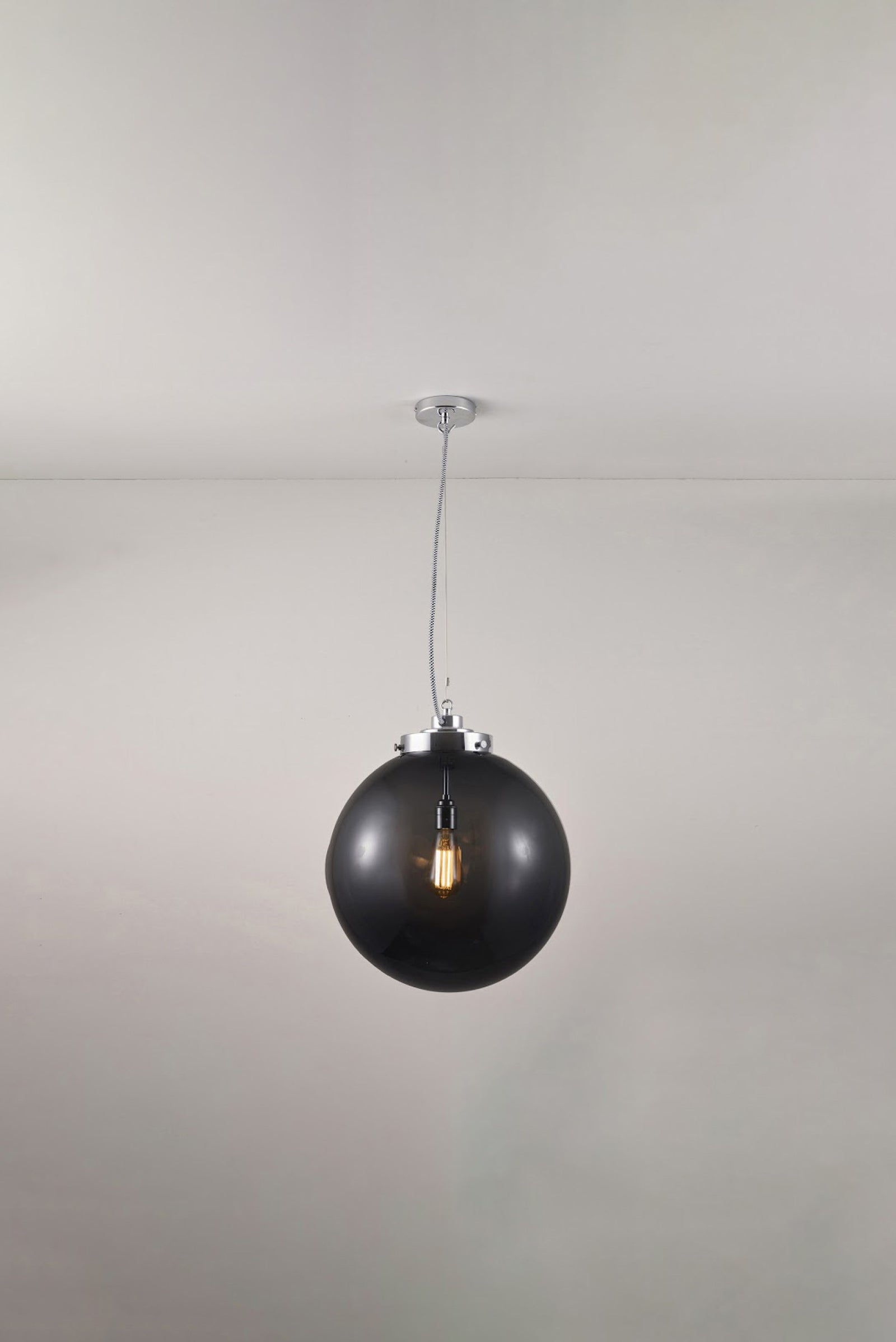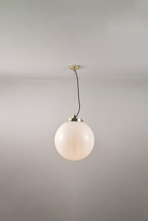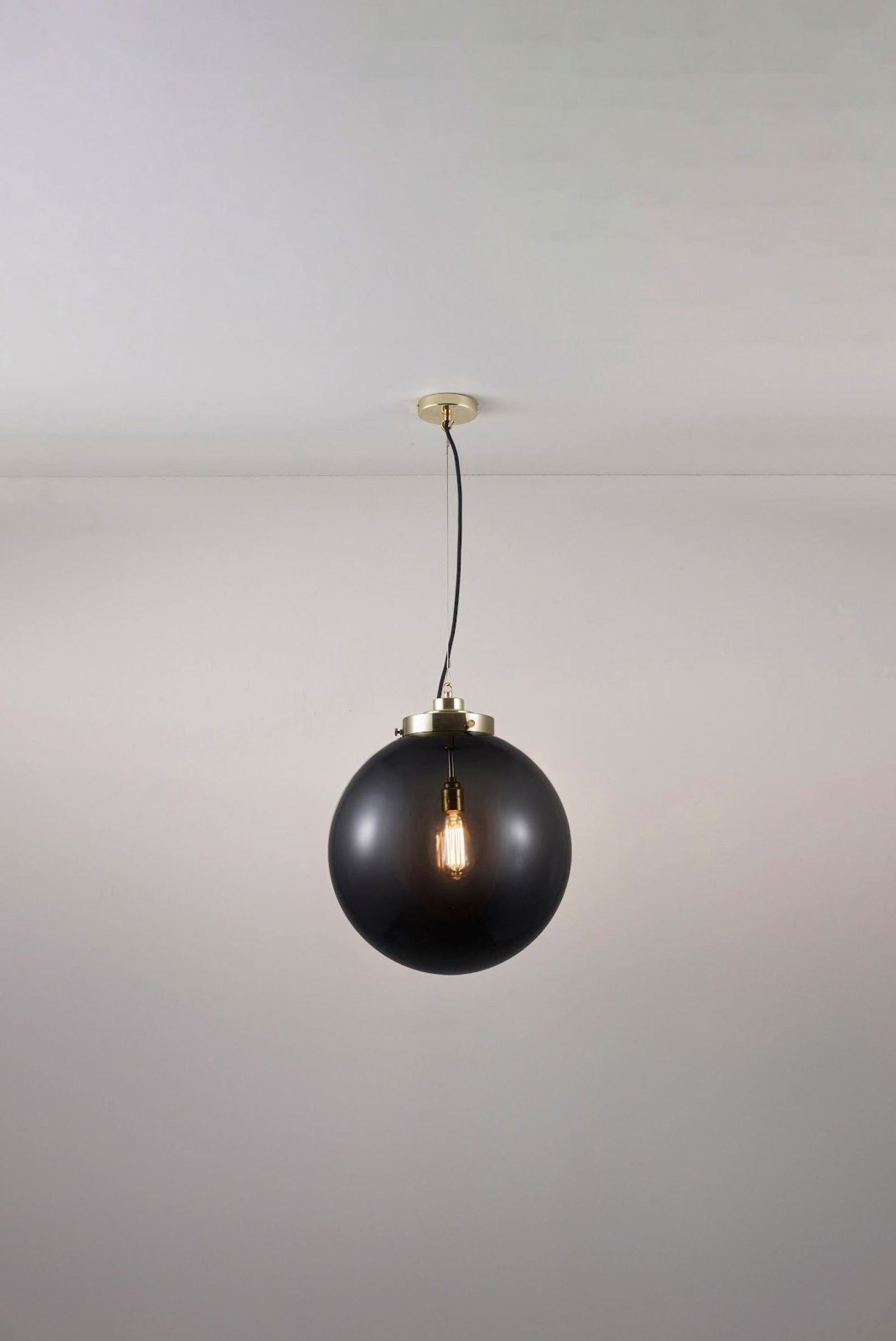 An elegant glass Globe Pendant that really packs a punch. Available in three different sizes and in two glass finishes. Choose between an opal or anthracite glass shade, with polished chrome or brass metalwork. The exposed squirrel cage light bulb adds contemporary style and the black & white cotton braided cable complements the design nicely.